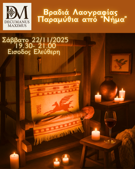 Σύντομη περιγραφή: Μια ζεστή βραδιά αφήγησης και λαογραφικής ατμόσφαιρας, με θεματικό άξονα το “νήμα” ως σύμβολο μνήμης, υφαντικής, ζωής και κοινότητας.